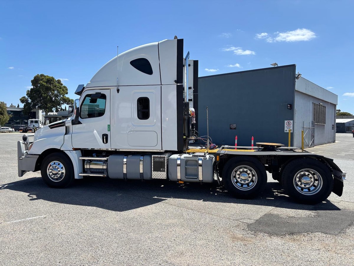 2021 Freightliner Cascadia 126 145000kg road train prime mover, Detroit DD16 600hp engine, Eaton 18 speed Roadranger manual transmission, Spicer R52-160 drive axles on Neway air bag suspension, alloy bull bar, 60" integrated sleeper with dual bunks, Dometic draw fridge, Bushman upright fridge, UHF, Icepack air conditioner, 50mm K Hitch fixed turntable, conveyor guards, water tank, tool box, lockable isolation switch, In excellent condition ex major fleet and has been maintained by Velocity on a service & maintenance plan. low km and ready to go